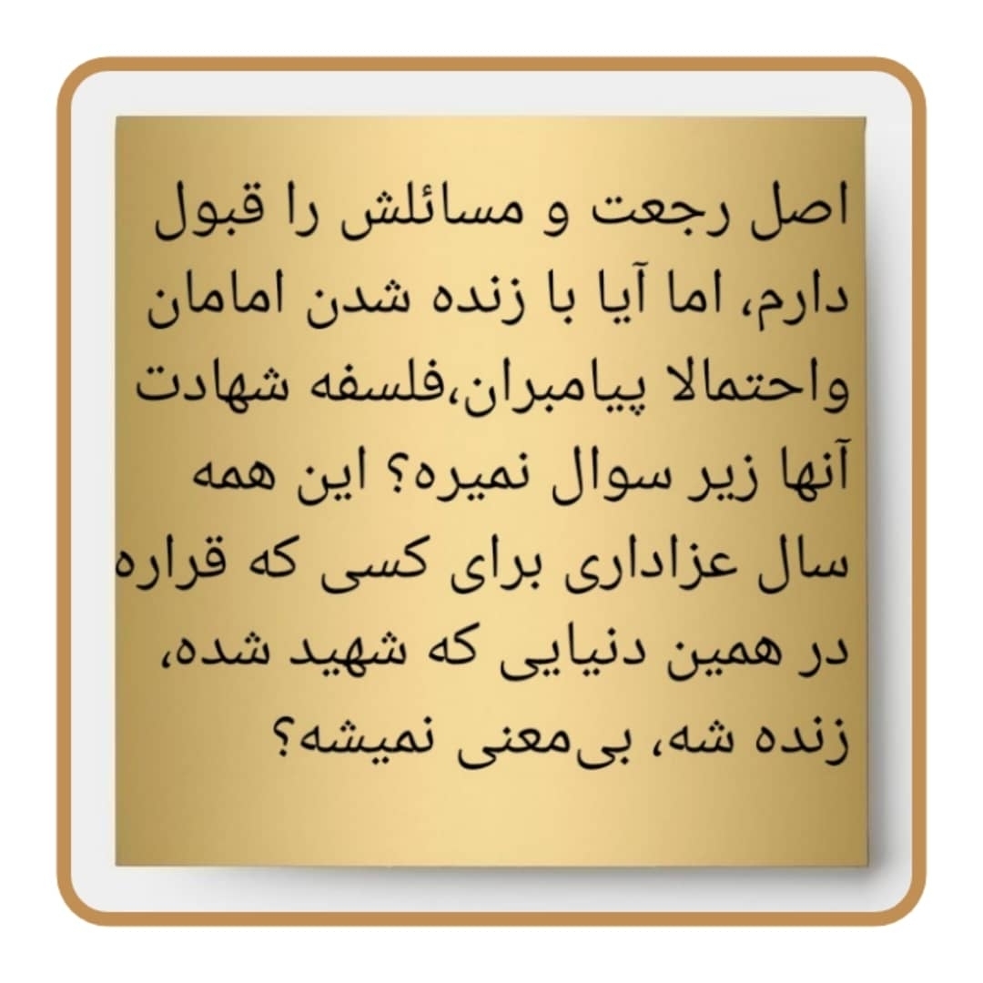 امام زمان علیه السلام نیز مانند سایر انبیا و امامان علیهم السلام، یا به شهادت و یا به مرگ طبیعی از دنیا خواهند رفت؛ اما حکومت الهی، هم چنان ادامه خواهد داشت، تا آخرین روز و قیامت فرا رسد. پس باید حاکمانی از اهل عصمت علیهم السلام باشند؛ لذا چون پیامبر یا امام جدیدی نخواهد آمد، رجعت آنان لازم میآید.(ادامه دارد...)